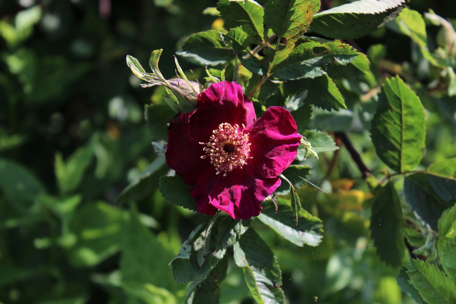 Il y a aussi un peu de rouge dans l'ancien massif du potager. Je devrais plutôt dire du pourpre-rouge. C'est la rose Basey's purple" qui possède cette couleur.